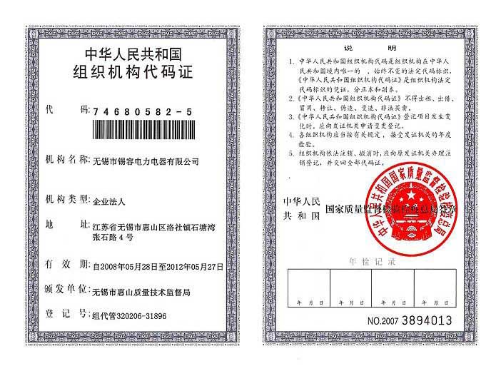 Organization code certificate release time:2020-07-20 04:35:16source:Wuxi Xirong Electric Appliance Co., Ltd.Click:2011